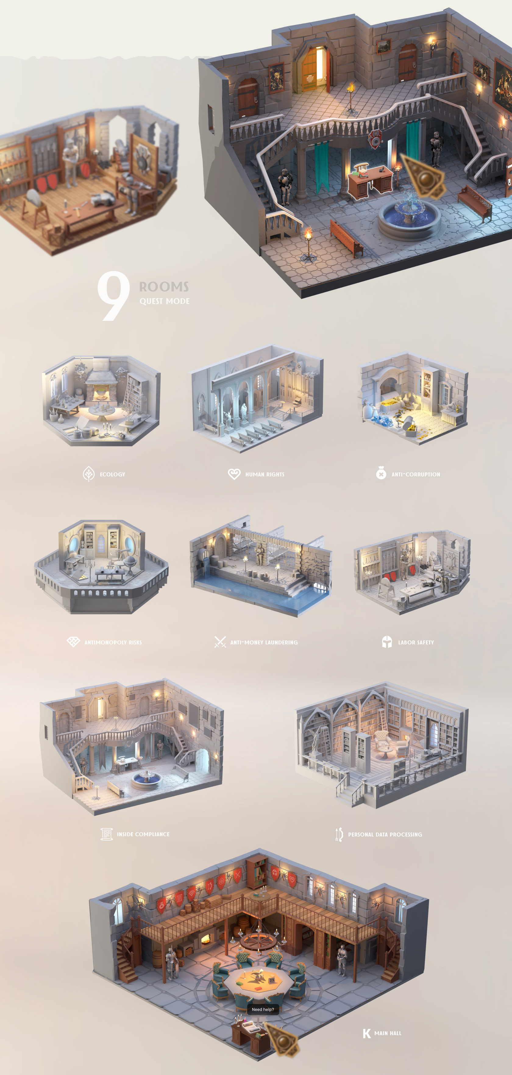 The goal is to explore the quest, search, study, collect information and finally get a trophy. Employees as characters examine castle grounds, interact with objects and educational content inside, collect knowledge crystals and get trophies for obtaining and learning educational materials.